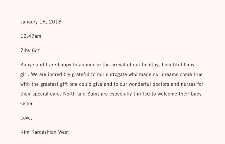 Seperti yang sudah diketahui, anak ketiga pasangan selebriti yang biasa disapa Kimye ini lahir pada Senin 15 Januari lalu melalui metode ibu pengganti (surrogate).