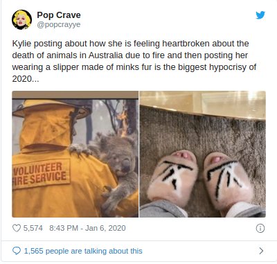 Awalnya, Kylie telah mengunggah sebuah story yang membahas tentang tragedi lebih kematian lebih dari setengah milyar hewan di Australia. Setelah itu, ia mengunggah story lainnya yang memperlihatkan sandal bulu rancangan Louis Vuitton. Para penggemar menganggapnya munafik karena masih mengenakan fashion item yang mengancam nyawa hewan, padahal ia baru saja menyuarakan kepeduliannya soal kebakaran hutan Australia.