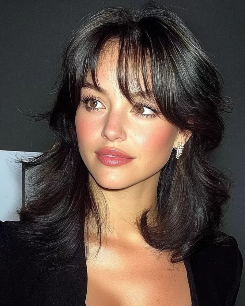 Penataan rambut ini ramping dengan lekukan alami, menonjolkan lapisan-lapisan rambut sehingga jatuh dengan mudah dan membingkai wajah dari samping. Belahan rambut yang sedikit di luar tengah dan highlight halus menambah kedalaman, membuat potongan rambut terlihat rapi namun santai.