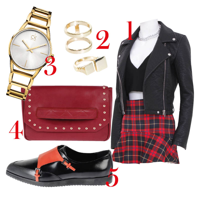 Dengan nuansa street style yang kental, Anda dapat menunjukkan sisi rebellious. Jaket kulit hitam dipadankan dengan rok bermotif plaid dan flat shoes buat gaya Anda lebih individual. (Marsya Labde / AS / TA / Image: Dok. Cosmo)