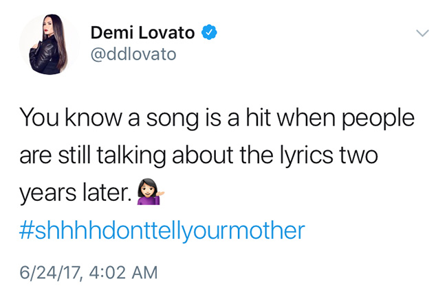 Pada bulan Juni lalu, dalam wawancara bersama Paper Magazine, Halsey mengomentari lirik lagu pop yang mengirimkan pesan buruk. Pelantun lagu Bad at Love ini kemudian mengutip lirik “don't tell your mother,” yang merupakan potongan dari lagu Demi Lovato, Cool for the Summer. Well, Demi malah tersanjung karena lagunya masih dibahas setelah dua tahun perilisannya.