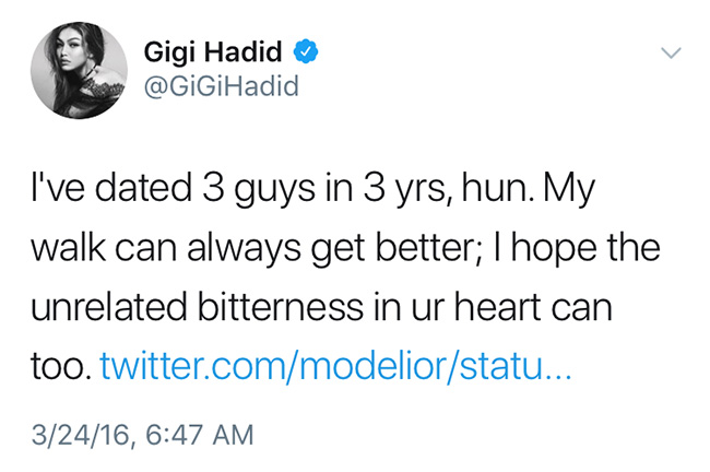 Seorang troll menulis tweet pada sang model, mengatakan: “Ketimbang ganti pacar setiap dua minggu sekali, lebih baik Anda belajar cara catwalk yang benar.” Tweet tersebut langsung dihapus tak lama setelah kekasih Zayn Malik ini merespons. Lol.