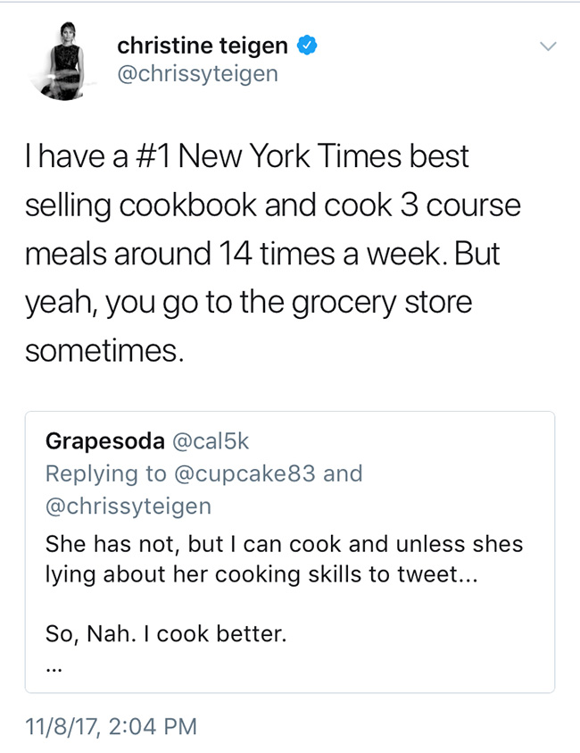Istri dari John Legend ini memang terkenal dengan kepribadiannya yang blak-blakan. Respons paling baru adalah ketika seseorang mengaku bahwa masakannya lebih lezat dibandingkan milik sang model. Umm, berani-beraninya dia meragukan kemampuan Chrissy!