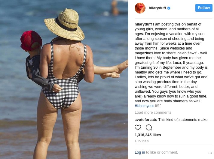 Hilary menerima banyak hujatan tentang bentuk tubuhnya, tapi bintang Disney ini merespons dengan sebuah caption Instagram inspiratif. Ingat ya ladies, jangan habiskan waktu Anda hanya untuk terlihat “sempurna.” Makin fierce, Hilary mengakhiri pesan mengharukan tersebut dengan hashtag kiss my a*s.