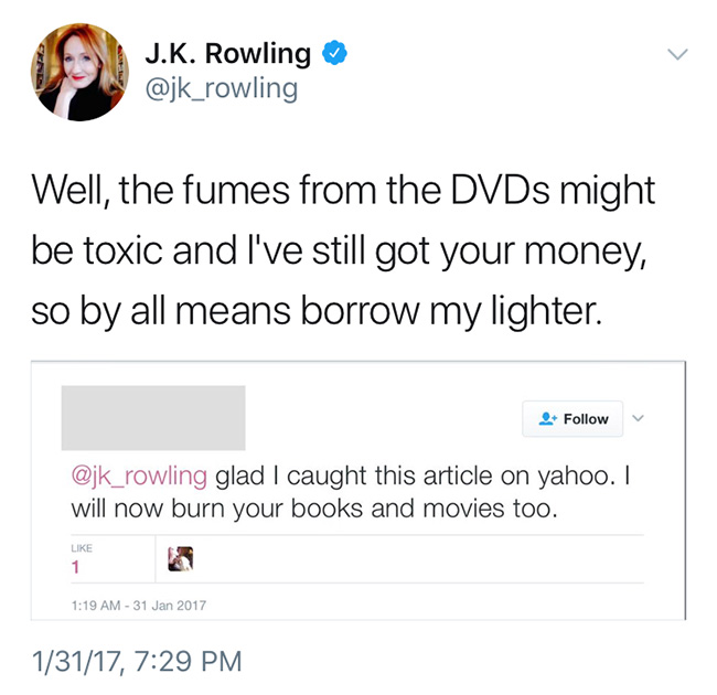 Apakah Anda geram pada J.K Rowling dan ingin membakar koleksi buku Harry Potter Anda? Silahkan saja, sang penulis tidak rugi, kok! Nice try, trolls.