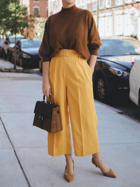 Padukan atasan cokelat dengan celana mustard dan tas senada biar warna outfit kamu tetap balance. Kamu bisa pakai ngopi di sore hari atau ke acara santai!