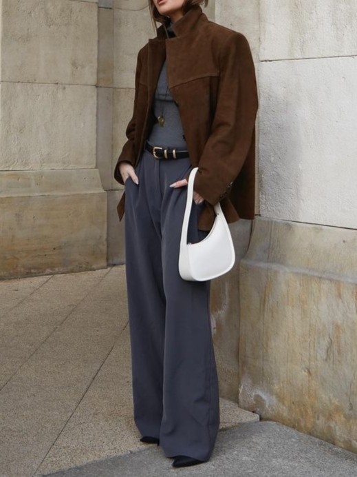 Padukan atasan cokelat kamu (seperti jaket kulit) dengan celana atau rok hitam potongan lebar. Kalau atasan kamu bukan leather, kamu juga bisa padu padankan dengan celana hitam leather biar seimbang!