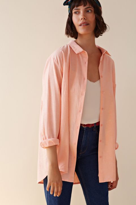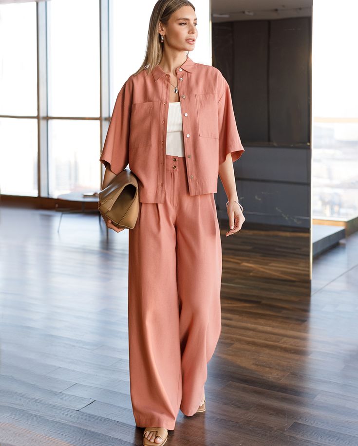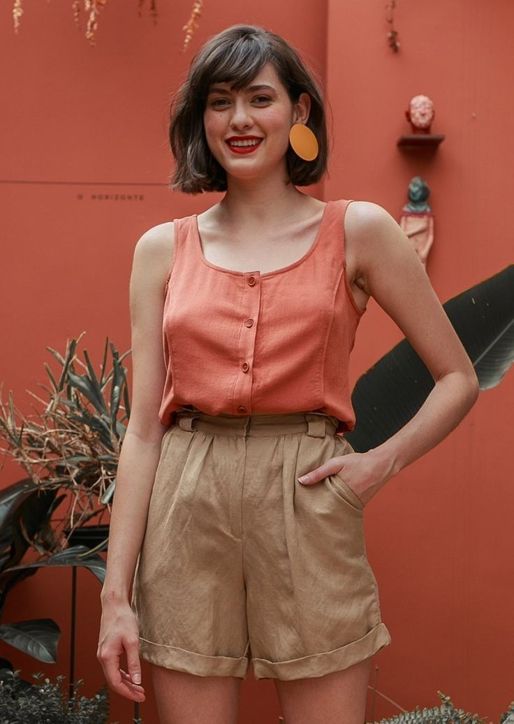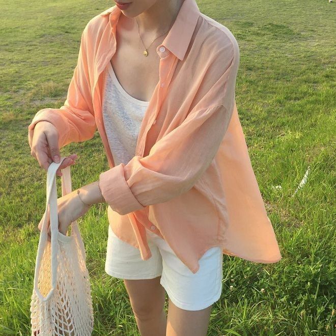 Mulai dari yang sederhana, yaitu outfit monokromatik. Kamu bisa memdukan atasan dan bawahan berwarna apricot senada, misalnya kemeja dengan celana palazzo. Lalu tambah tank top putih sebagai inner.