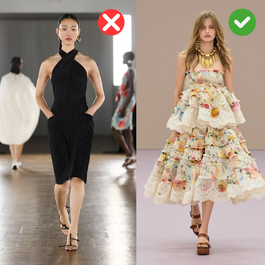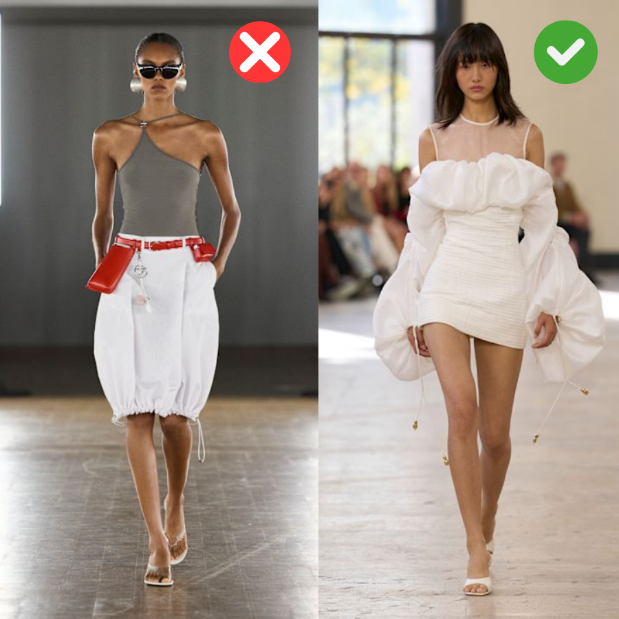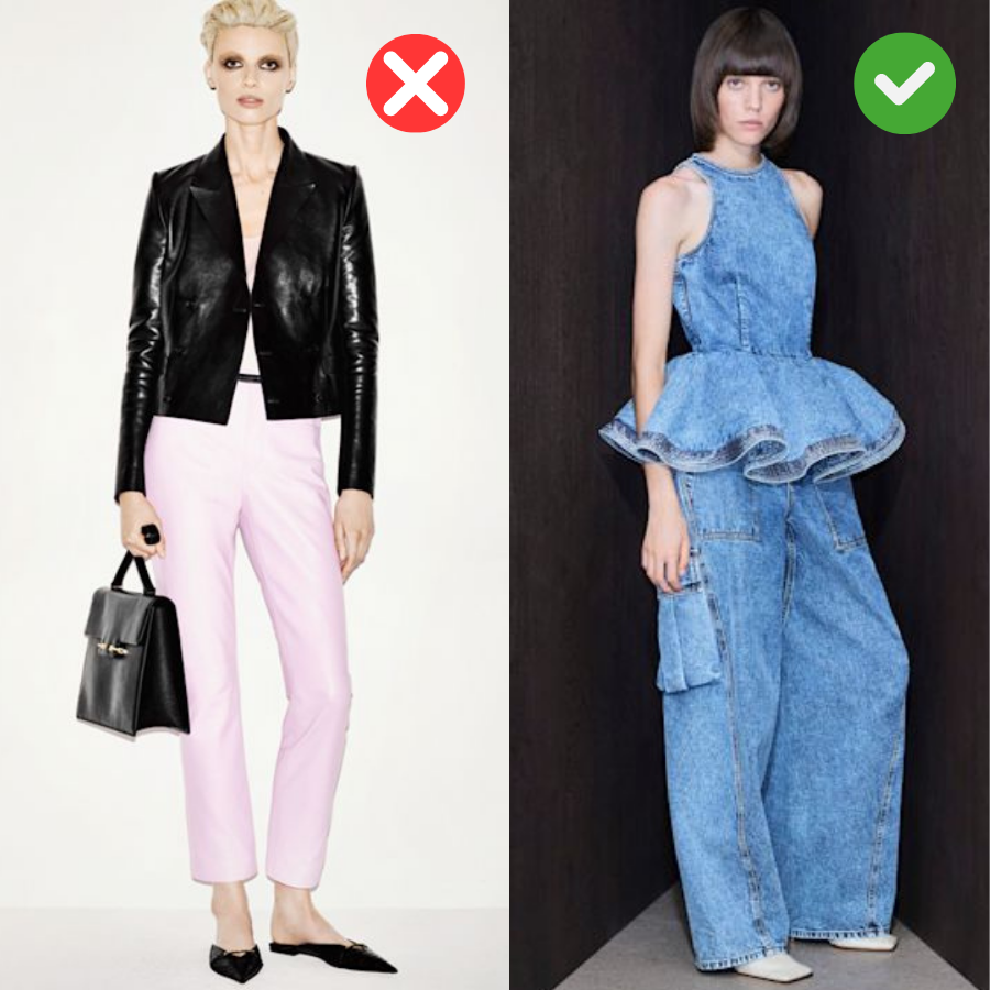 Celana straight-cut dan rok lurus sering kali dianggap netral, tetapi tidak selalu membantu dalam kasus kepala besar. Garis lurus dari pinggul hingga mata kaki menciptakan siluet yang datar dan tidak menambah volume di bagian bawah tubuh. Hal ini memberikan tampilan visual area tubuh atas yang terlihat lebih dominan dan terlihat pendek.