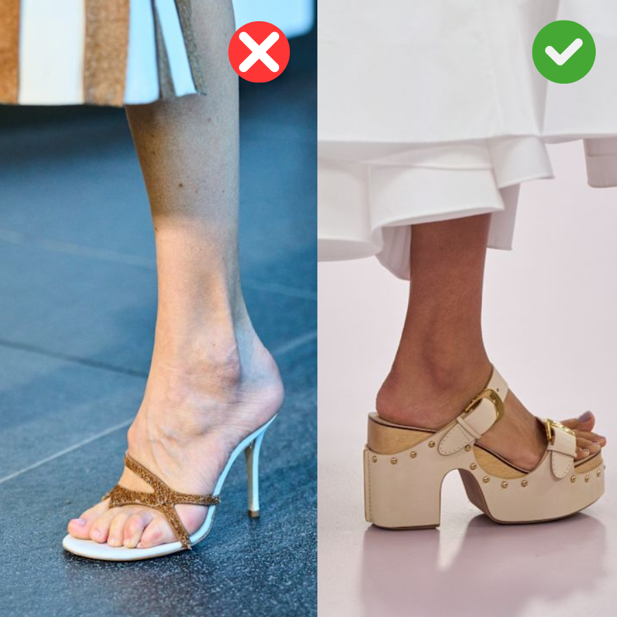 Sepatu adalah hal krusial dalam menentukan tampilan proporsi tubuh. Bagi pemilik kepala besar, sepatu yang terlalu ramping, seperti pointed-toe heels, flat berujung lancip, sandal heels atau loafers dengan siluet sangat tipis dapat menciptakan ketidakseimbangan visual. Ketika kaki tampak lebih kecil, bagian atas tubuh, terutama kepala, terlihat semakin besar.