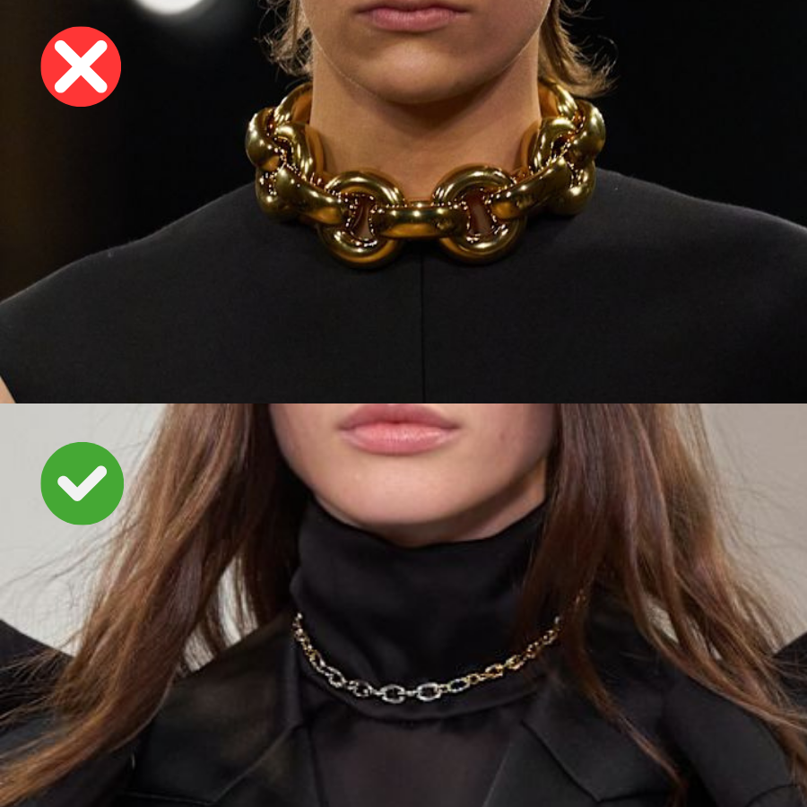 Aksesori besar pada area wajah dan leher dapat memperkuat kesan “ramai” di bagian atas tubuh, membuat kepala terlihat lebih besar. Anting chandelier, kalung chunky, scarf tebal, atau anting panjang berstruktur berat menambah volume visual yang tidak diperlukan.