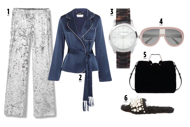 1.Celana, Mango, Rp899.000,-. 2. Atasan, Chloe, price upon request. 3. Jam tangan, Ted Baker, Rp2.875.000,-. 4. Kacamata, Stella McCartney, price upon request. 5.Tas, Mango, Rp599.000,-. 6. Sandal, Miumiu, price upon request.