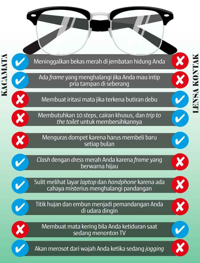 Oh, the dilemma. Apakah sebaiknya pakai kacamata, atau lensa kontak? Memang betul, keduanya memiliki keuntungan dan kerugiannya masing-masing. Sebaiknya, Anda pilih yang sesuai dengan kepribadian Anda. Begini menurut Cosmo: