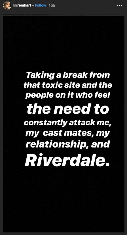 Dilansir dari akun Instagramnya, bintang Riverdale, Lily Reinhart memutuskan bahwa ia akan rehat sejenak dari dunia media sosial Twitter.