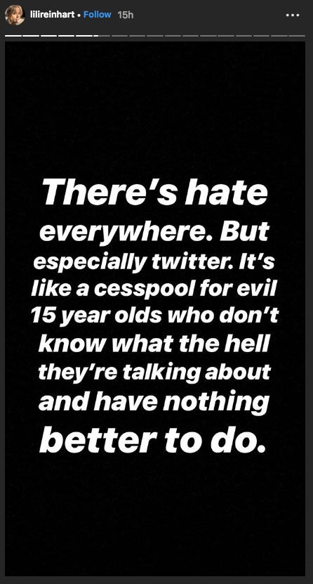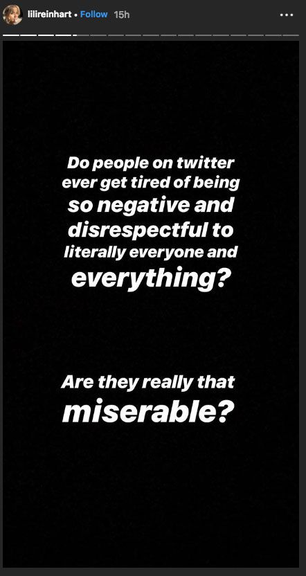 Di dalam salah satu Instastory-nya ia menulis, “Apakah orang-orang di Twitter tidak pernah merasa lelah akan menjadi terlalu negatif dan tidak sopan kepada semua orang dan kepada apapun itu? Apakah mereka benar-benar se-menyedihkan itu?”