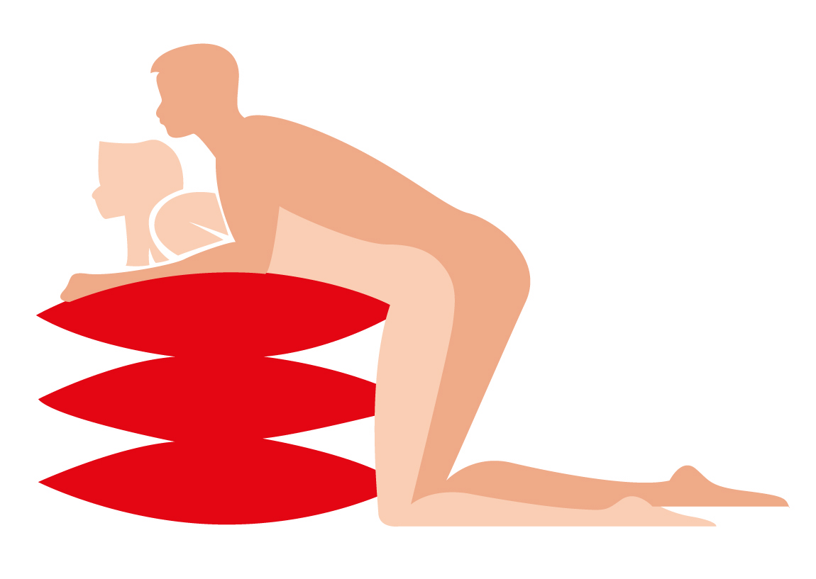 Aturlah tumpukan bantal besar di lantai hingga mencapai ketinggian kurang lebih 50 cm, lalu berlututlah hingga bentuk tubuh Anda mengikuti bentuk kurva tumpukan bantal. Kemudian biarkan si dia melekatkan tubuhnya dengan Anda, dengan menghadap ke arah yang sama. Buka selangkangan Anda, sehingga dia bisa berlutut di antara sela-sela diantara kaki untuk kemudian “menyerang” Miss Cheerful dari belakang. Sensasinya? va va voom!