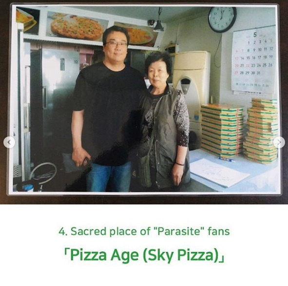 Di awal film ini kita mengetahui bahwa keluarga Kim mencari nafkah dengan menjadi tukang lipat kotak pizza bernama Pizza Age. Di kehidupan nyata, restoran pizza ini bernama Sky Pizza dan merupakan toko pizza lokal yang sudah berdiri selama 17 tahun. Kabarnya pemilik restoran pizza ini yang mengajarkan mereka cara melipat kotak pizza dengan benar. Kotak pizza yang menjadi properti di film pun akhirnya dipajang di dalam toko untuk menarik perhatian pengunjung dan di luarnya ada foto sang pemilik bersama sutradara Bong Joon-ho sebagai promosi. Selain berfoto, yang jelas kamu juga harus mencicipi langsung kelezatan menu restoran ini seperti “Rich Gold Sweet Potato Pizza” yang menggunakan keju alami, fried chicken, dan ayam goreng crispy ("Dakgangjeong") bersaus asam-manis dengan resep rahasia sang pemilik.