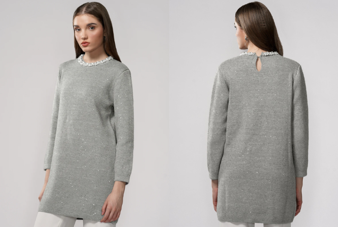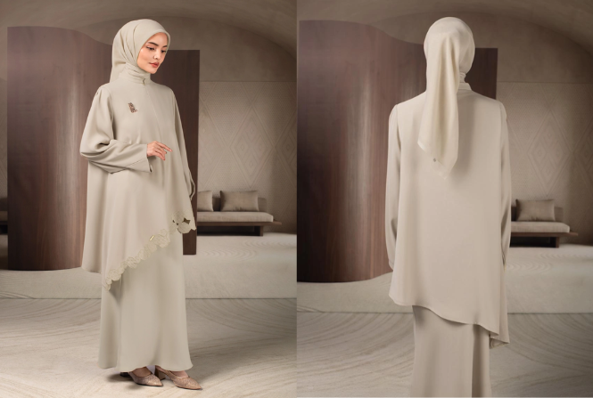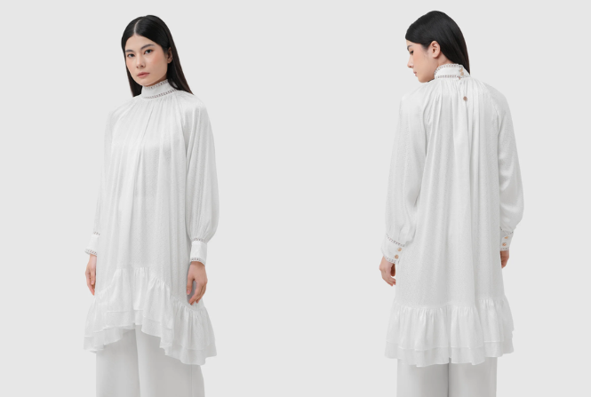 Tampilan satu set sederhana ini menampilkan tunik panjang dan mengalir dalam warna gading yang langsung terasa elegan dan santai. Siluetnya longgar dan menjuntai indah, menciptakan bentuk yang tenang dan anggun sekaligus memungkinkan gerakan yang mudah. Detail bordir geometris halus yang ditempatkan di bagian depan menambahkan sorotan yang halus, memberikan pernyataan yang tenang tanpa mengurangi estetika minimalisnya.