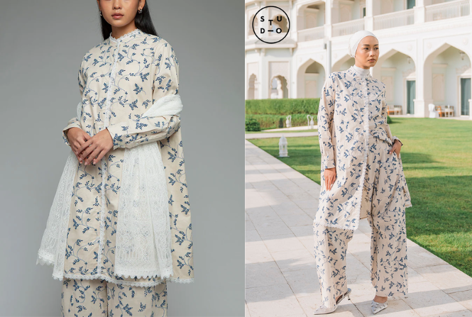Tunik bermotif ini hadir dalam warna krem lembut dengan motif bunga biru yang halus, memberikan kesan tenang dan feminin yang sempurna untuk gaya Ramadan. Siluetnya sederhana namun elegan, menampilkan kerah mandarin yang terstruktur, lengan panjang, dan potongan lurus yang nyaman dikenakan di atas celana lebar yang senada. Kamu bisa mix and match tunik ini dengan syal renda putih yang menambah sentuhan anggun dan lembut, tanpa terlihat terlalu berlebihan.
