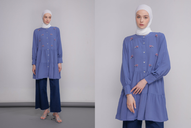 Tip menggunakan tunik ini adalah dengan memadukannya bersama celana polos serta hijab polos atau hijab motif bernuansa senada agar tampilan terlihat lebih stylish dan seimbang.
