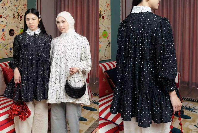 Tersedia dalam motif Polka Putih dan Polka Hitam klasik, pakaian ini menghadirkan motif polkadot abadi yang menambah daya tarik visual sekaligus mempertahankan tampilan yang bersih dan rapi untuk acara kasual maupun semi-formal.