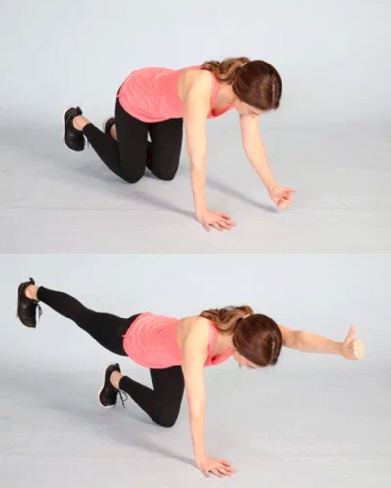 Tahan selama 2 detik, kemudian kembali ke posisi awal. Ulangi gerakan yang sama dengan lengan kanan dan kaki kiri.