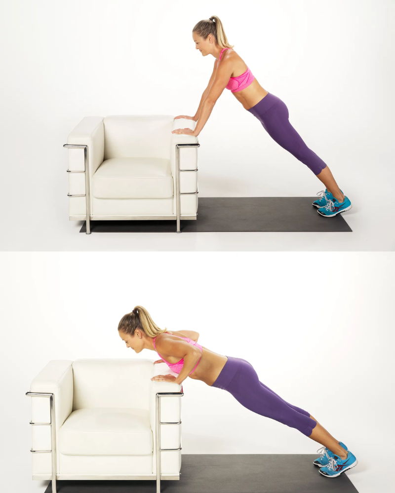 Untuk versi HIIT, coba lakukan 20 repetisi, istirahat selama dua menit, lalu ulangi beberapa ronde sesuai kemampuan. Kalau kamu kesulitan menyentuh lantai, kamu bisa menumpukan tangan di permukaan yang stabil seperti bangku kokoh agar gerakannya lebih nyaman dan push-up lebih terkontrol.