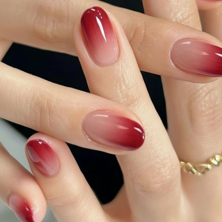 Inspirasi kedua ini super chic. Gradasi merah ke nude yang lembut dan glossy.