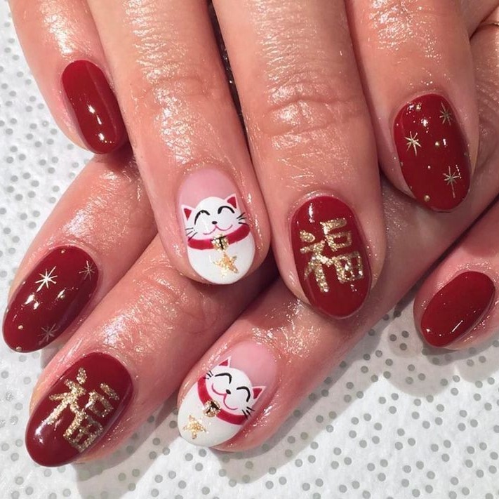Kombinasi kuku merah glossy dengan ilustrasi maneki-neko (kucing pembawa keberuntungan) langsung memberi nuansa Imlek yang cheerful dan fun.