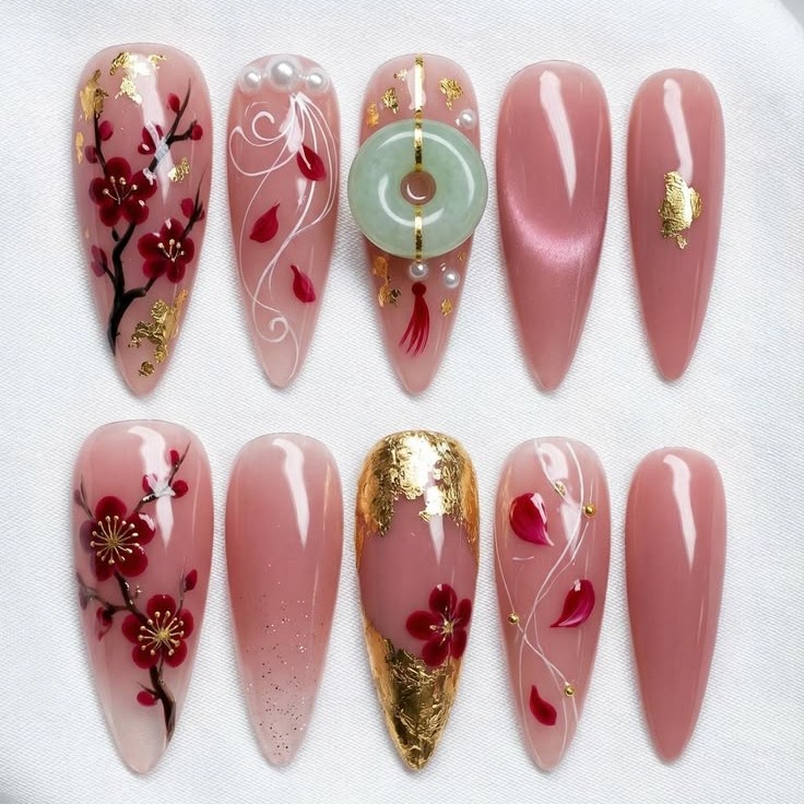 Ada juga aksen ornamen jade berbentuk lingkaran yang memberi sentuhan tradisional sekaligus unik. Perpaduan elemen modern dan klasik ini bikin nail art terlihat lebih sophisticated!