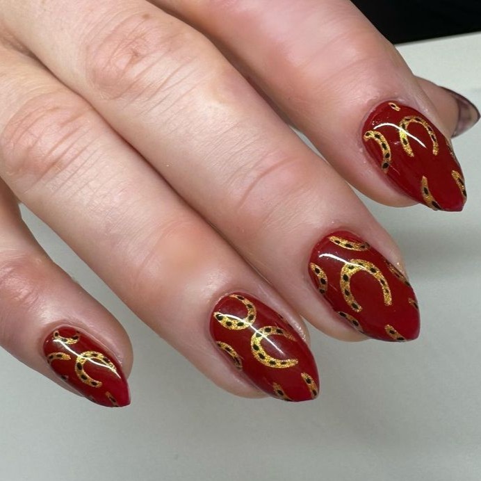 Inspirasi kelima menunjukkan kuku merah glossy dengan aksen gold berbentuk siluet tapal kuda yang simpel.