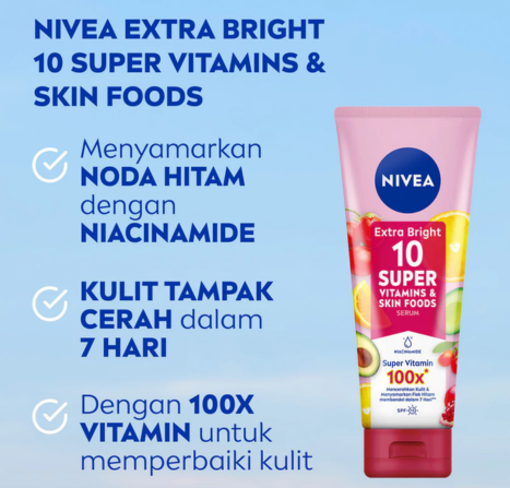 Buat kamu yang mulai sadar bahwa kulit tubuh juga butuh perhatian ekstra, NIVEA menghadirkan Body Serum Extra Bright 10 Super Vitamins SPF15 sebagai solusi praktis untuk mengatasi kulit kusam, kering, hingga noda hitam membandel. Tidak hanya melembapkan, body serum ini dirancang dengan pendekatan intensif untuk membantu tampilan kulit terlihat lebih cerah dan merata hanya dalam waktu tujuh hari, sehingga efek glowing-nya terasa lebih nyata dan bukan sekadar klaim.