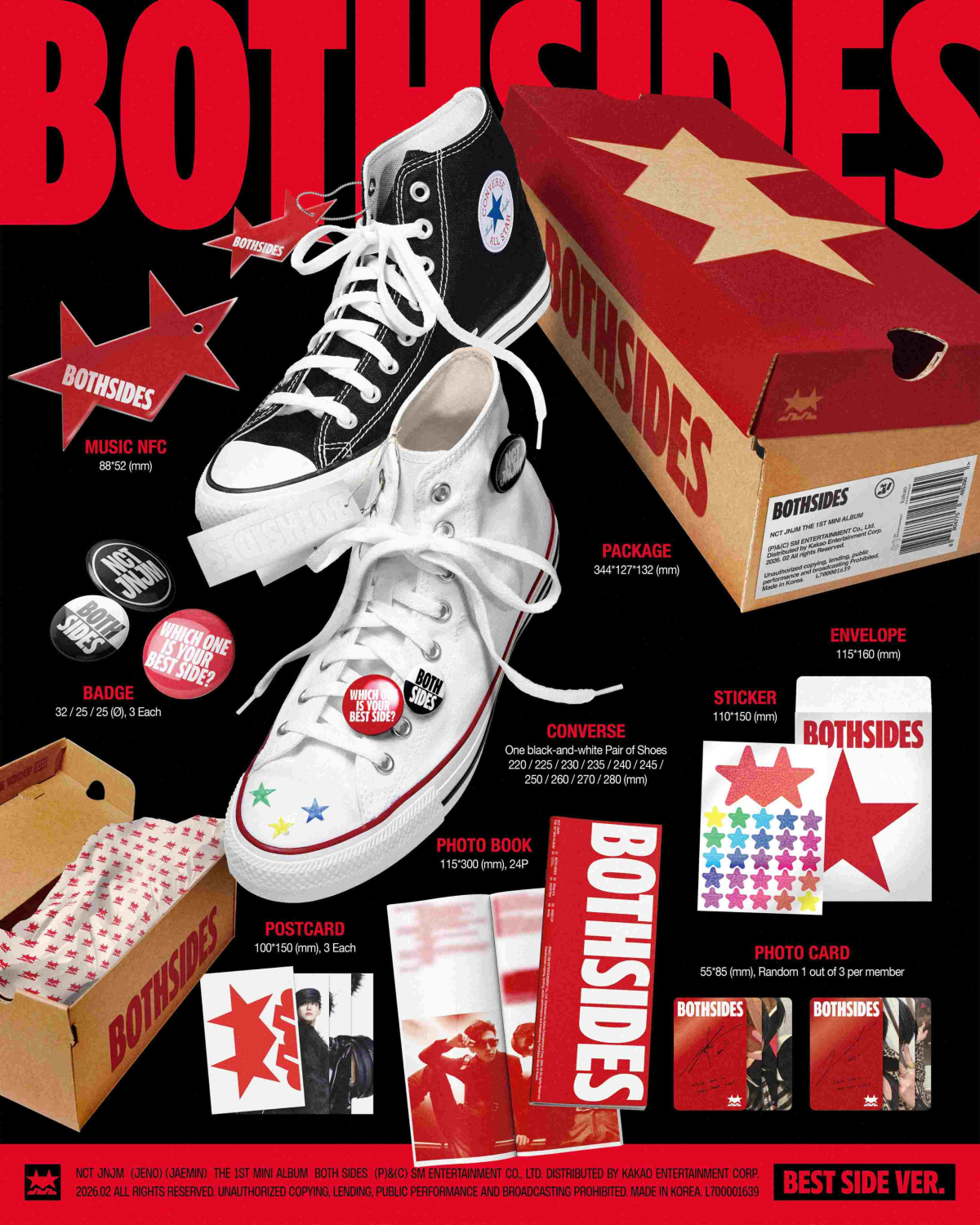 Hal tersebut bukan mustahil untuk proyek debut NCT JNJM. Salah satu versi dari album mereka yaitu BEST SIDE VER. datang dengan sepasang sepatu Converse di dalamnya! Serunya lagi, sepatu Converse yang ada di versi album ini disiapkan dengan warna yang berbeda yaitu 1 hitam dan 1 putih.