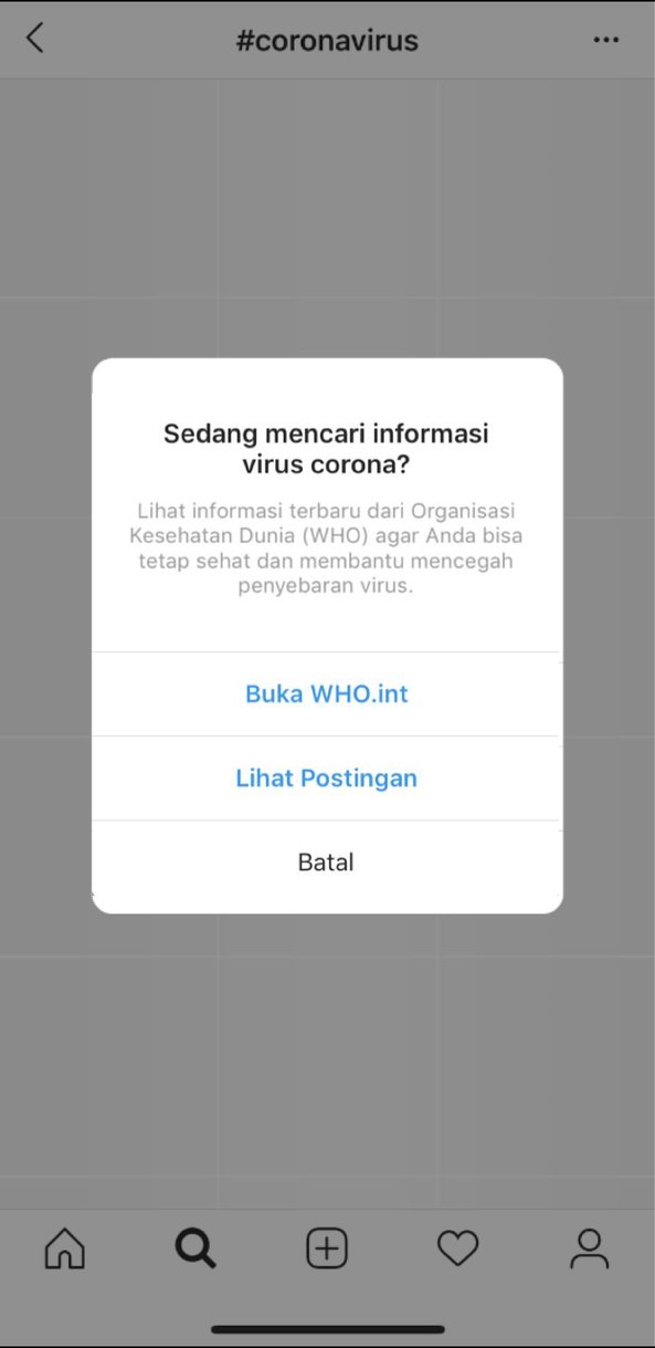 1. Instagram menghapus berbagai misinformasi terkait COVID-19. Ketika pengguna mengetuk tagar terkait COVID-19, Instagram akan mengarahkan pengguna untuk mencari informasi terkait virus corona di sumber-sumber terpercaya seperti @WHO, @CDC, dan otoritas kesehatan setempat.