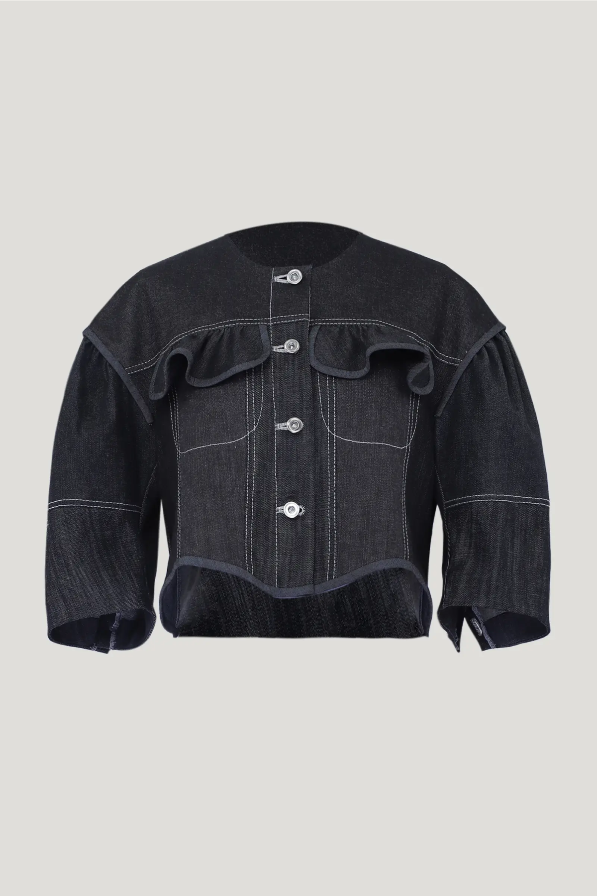 Toton menggubah jaket denim pendek yang biasanya bergaya kasual dan boyish jadi lebih feminin. Triknya adalah lengan yang dibuat model puff dan tambahan detail ruffles. Cocok kamu padukan bersama dress pastel untuk tampil festive di akhir pekan.