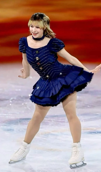 Pada Winter Olympics Figure Skating Exhibition Gala yang digelar di Milan, Alysa mengenakan attire navy dengan siluet peplum. Pada lengan dan bagian rok, keduanya dihiasi detail puff yang menjadikan look ini mempunyai kesan princess.