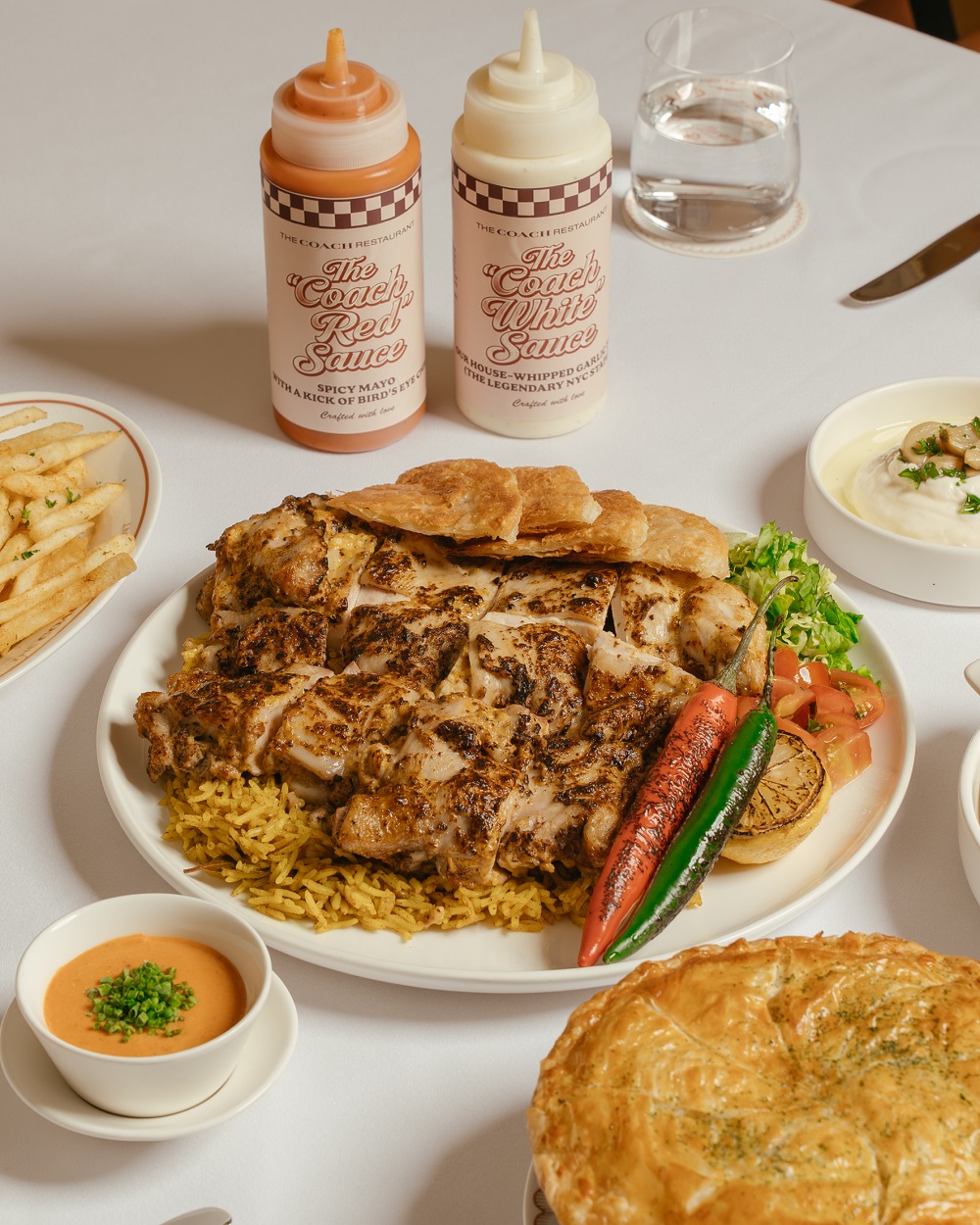 - Charcoal Chicken with Rice Pilaf, ayam berdaging juicy yang dipanggang dengan arang, disajikan di atas nasi pilaf harum dengan rempah-rempahan. Akan lebih lengkap jika diteteskan The “Coach White” Sauce dan The “Coach Red” Sauce.