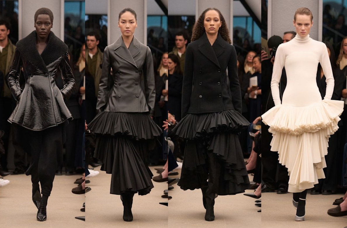 Beberapa look menampilkan peacoat dan jaket berstruktur sebelum melebar dramatis di bagian bawah, membentuk peplum yang skulptural dalam palet hitam, abu-abu, dan krem. Di look lain, jaket double-breasted dipadukan dengan rok pleated bertingkat yang bergerak dinamis, menciptakan kontras antara bagian atas yang tegas dan bagian bawah. Highlight koleksi ini adalah kombinasi turtleneck putih dengan cascading ruffle skirt yang hasilnya memberikan kesan minimal di atas dan dramatis di bawah.