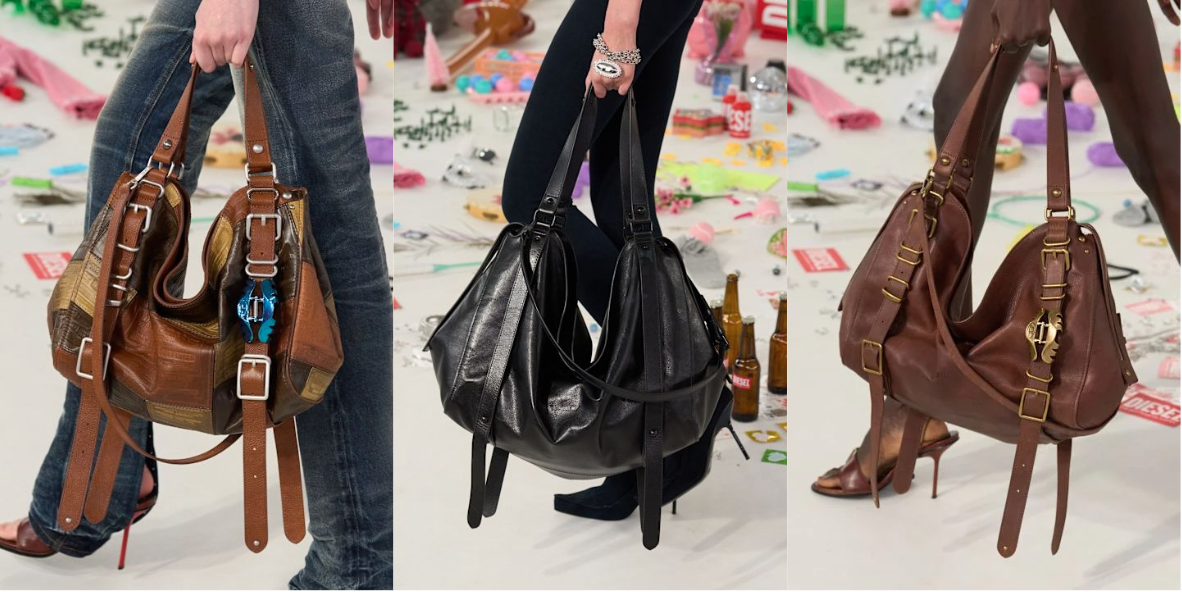 Glenn Martens membawa narasi kehidupan malam yang liar ke atas runway melalui tas D-One yang merayakan estetika after-party. Terinspirasi dari konsep "dirty stop out" atau momen bergegas pulang setelah malam yang panjang, tas U-shaped dengan volume ekstra besar ini merepresentasikan gaya berbusana "a hot mess". Dengan sistem harness dari gesper berukuran besar dan tali yang tergerai bebas, tas ini dirancang untuk mereka yang memiliki rasa percaya diri tinggi—seseorang yang tampil memukau bukan karena kerapiannya, melainkan karena energi dari malam yang luar biasa. Di antara berbagai aksesori Diesel lainnya, siluet ini menjadi pusat perhatian bagi mereka yang beraktivitas dari pagi sampai malam, penuh dengan bermacam agenda.