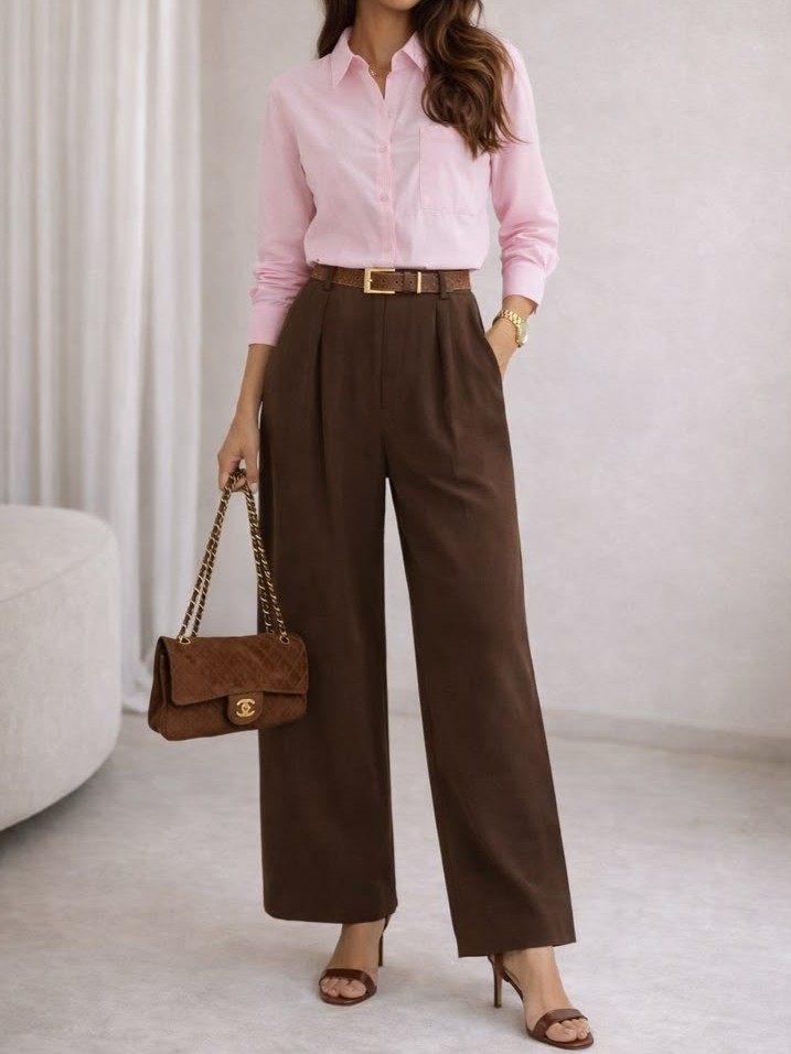 Pink dan cokelat adalah kombinasi yang surprisingly cantik. Dalam inspirasi pertama, atasan pink lembut dipadukan dengan celana cokelat high-waist untuk menciptakan tampilan yang soft tapi tetap polished.