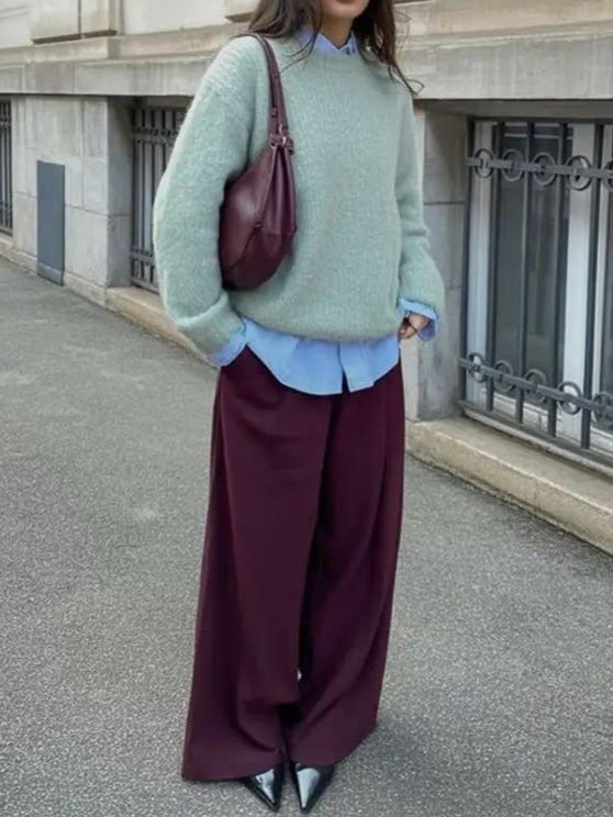 Kalau menilik dari referensi kedua Cosmo, layering antara kemeja biru dan sweater tosca dengan celana cokelat menghasilkan look yang cozy tapi tetap stylish.