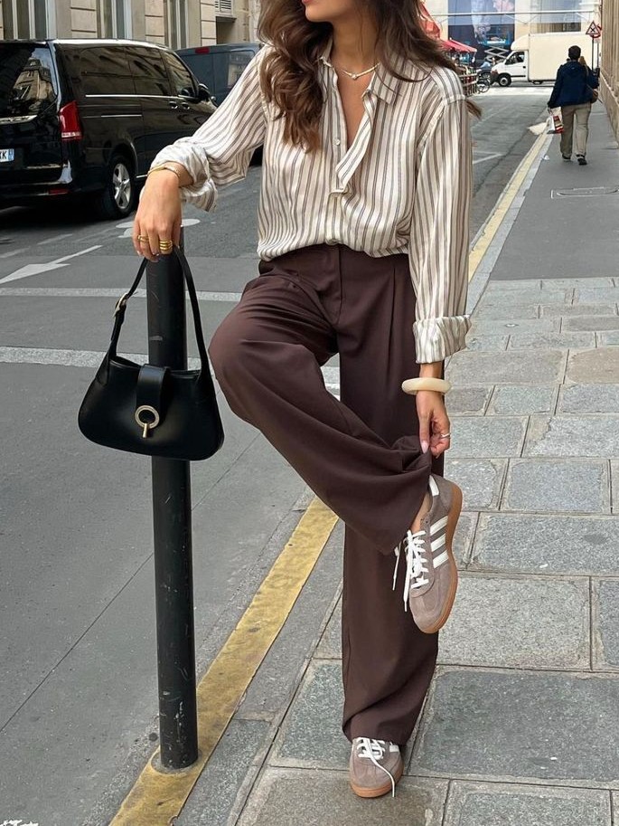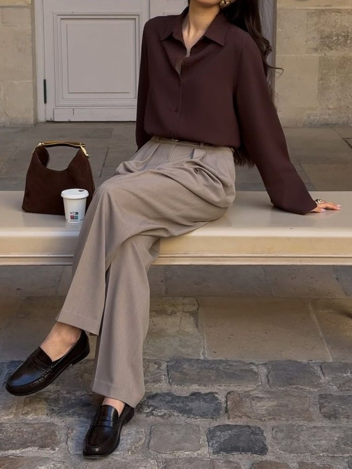 Dalam inspirasi terakhir, kemeja putih atau cream dipadukan dengan celana cokelat menciptakan tampilan yang effortlessly chic.