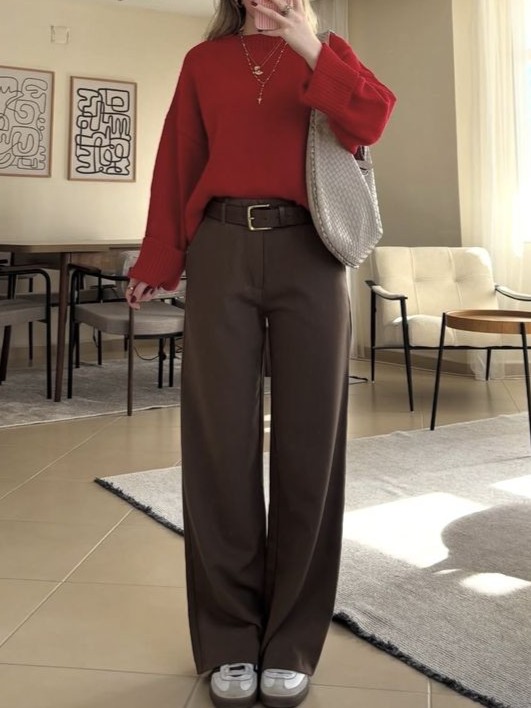 Di referensi keempat, sweater merah dipadukan dengan celana cokelat menghasilkan look yang bold tapi tetap wearable. Kamu ingin sebuah statement dalam tampilanmu? Ya jelas perpaduan ini yang harus kamu pilih!