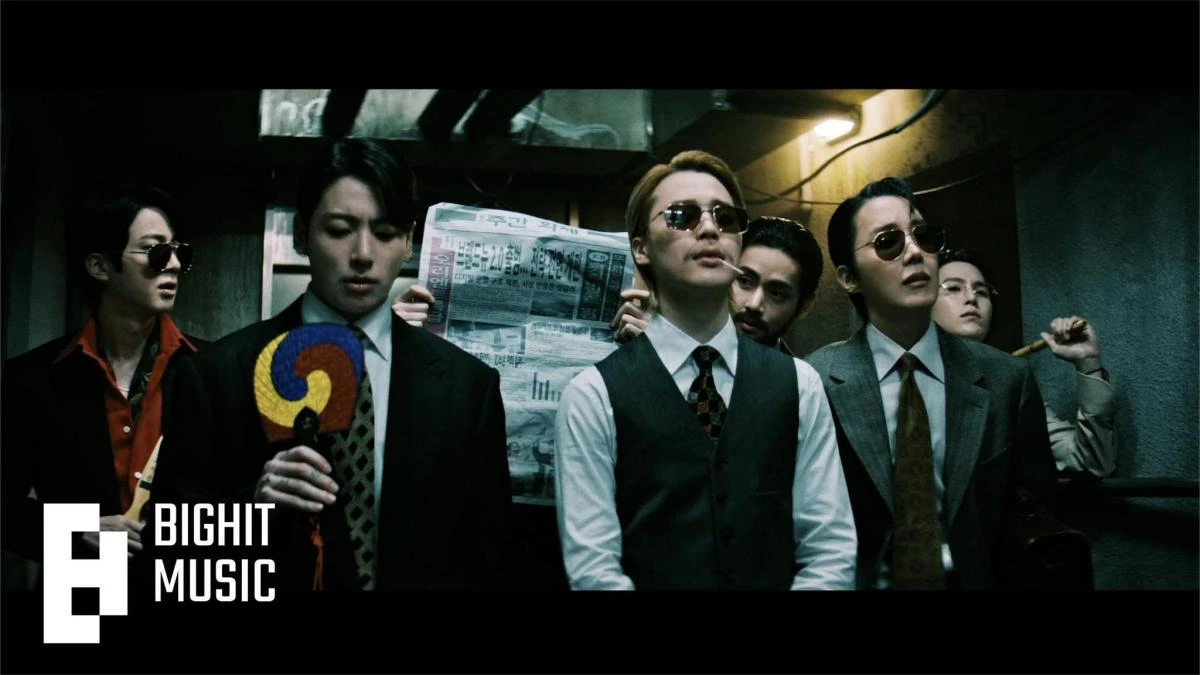 Saat pintu lift terbuka, kita melihat para member tampil sangat karismatik dengan setelan jas rapi dan kacamata hitam. Namun, jika kamu perhatikan lebih detail, kamu akan menemukan barang-barang yang sangat tidak nyambung, seperti penggaruk punggung, kipas Taegeuk, suling bambu, hingga koran yang dibaca secara terbalik.
