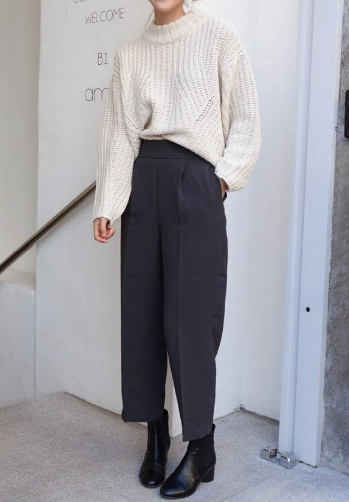 Jika bahan sweater sangat tebal, gunakan karet rambut untuk mengikat bagian bawah sweater di satu sisi, lalu lipat ke dalam. Ini adalah trik rahasia untuk mendapatkan tuck yang rapi tanpa membuat celana terasa sesak.