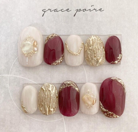 Set kuku ini menampilkan dasar warna maroon yang kaya, memberikan kesan yang dalam, elegan, dan sedikit sensual. Warnanya tampak mengkilap, meningkatkan kesan mewah sekaligus membuat aksen emas menonjol dengan indah.