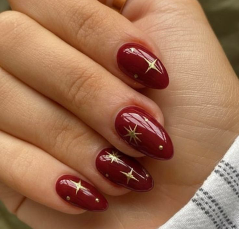 Detail emas muncul dalam bentuk aksen bintang halus yang tersebar di setiap kuku, menciptakan desain yang terinspirasi dari langit. Bentuk bintang metalik yang halus ini dipadukan dengan stud emas kecil, menambahkan dimensi halus dan sentuhan tekstur. Kombinasi warna maroon dan emas, bersama dengan motif bintang, menghasilkan desain yang terasa simple tapi juga mewah.