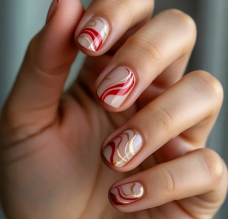 Jika kamu mencari manikur dengan energi karakter utama, inilah jawabannya. Nuansa merah tua berpadu dengan aksen emas berkilauan dalam desain yang abstrak, menyeimbangkan kreativitas berani dengan sentuhan mewah.