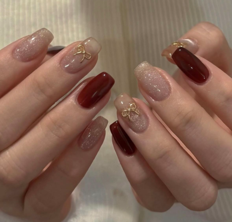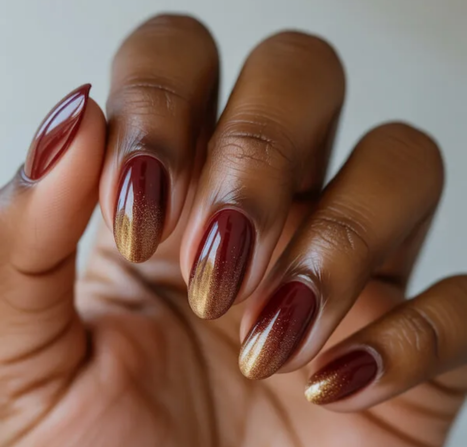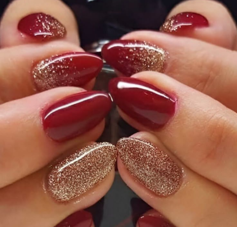 Perpaduan antara maroon dan emas halus dan mulus, memberikan efek gradien yang menambah kedalaman dan daya tarik visual tanpa mengalahkan tampilan keseluruhan. Elemen glitter ini tampak padat di dekat ujung atau di seluruh kuku, menangkap cahaya dan menambahkan dimensi berkilauan terhadap warna maroon yang lebih gelap. Kombinasi warna solid dan detail glitter menghasilkan komposisi yang seimbang, untuk tampilan pestamu.