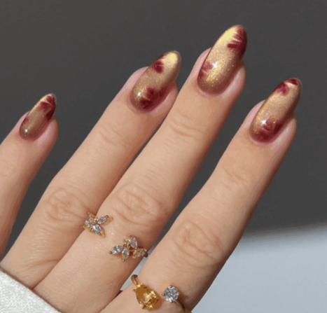 Kuku berbentuk almond ini menghadirkan "golden hour" ke jari-jari Mama. Basis cat-eye emas magnetik menangkap setiap pantulan cahaya dengan kilauan multidimensi seperti beludru. Untuk menyempurnakan tampilan, pola ala marmer maroon smoky menyebar ke tepian, menciptakan transisi lembut seperti cat air yang terasa sangat mewah.